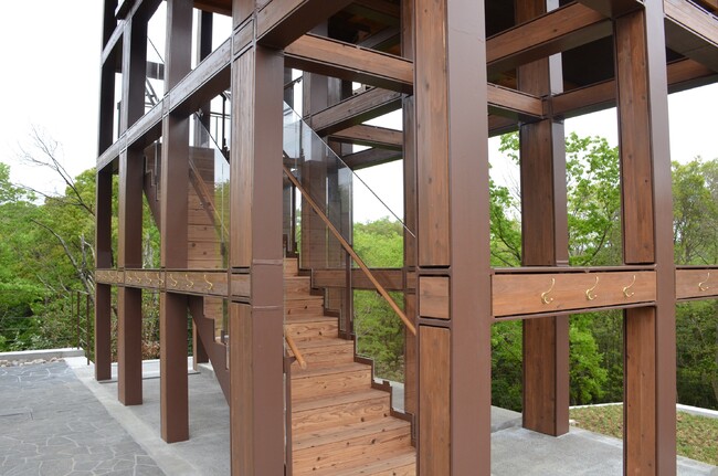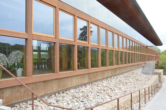 当社は、自然に優しい素材が最大限に活用されていることが大きな特徴である同施設において、オリジナル木材 製品である「Gywood(R)」(「ウッドデザイン賞 2018」林野庁長官賞受賞)や「ObiRED(R)」(「ウッドデザイン賞 2020」受賞)をはじめ、国産材を約 30 ㎥納材いたしました。外壁、窓枠の格子、構造材の化粧材、内装の造 作等、随所に使用されており、建物全体の木質感を高めるとともに、空間に彩りと安らぎを与えています。