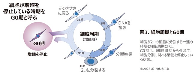 細胞には、分裂して増殖する細胞周期と呼ばれる状態(G1期、S期、G2期、M期からなる)と、増殖を停止しているG0期と呼ばれる状態が存在します(図3)。