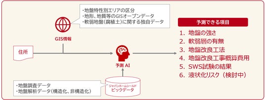 地盤AI推論モデルは、住所などの位置情報を入力するだけで、地盤の強さや腐植土の有無、さらに地盤改良工法や改良工事概算費用など建築前に欲しい地盤情報をAIで予測します。