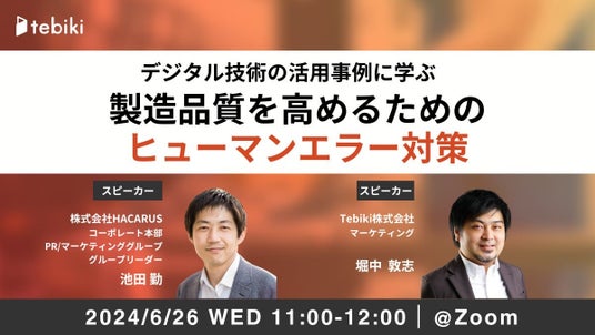 Tebiki株式会社(本社:東京都新宿区、代表取締役:貴山敬)は、株式会社HACARUS(本社:京都市中京区、代表取締役CEO:染田貴志)と、「デジタル技術の活用事例に学ぶ 製造品質を高めるためのヒューマンエラー対策」と題したオンラインセミナーを2024年6月26日に開催することをお知らせします。