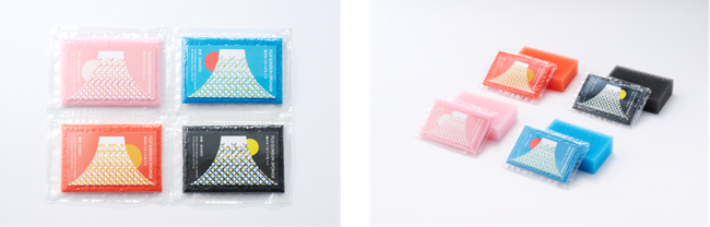 日本人の心の拠り所である富士山。眺めるだけでなんだか心が洗われるような、そんな存在を身近に感じることで、洗う時間がもっと豊かになりますように。そういった願いを込めて制作したスポンジです。調和やご縁を意味する日本古来の七宝という和柄できらめく泡を、富士山を彩る1日の移ろい(朝、昼、夕、晩)を日本の伝統色(曙色、天色、緋色、呂色)を用いて表現しています。