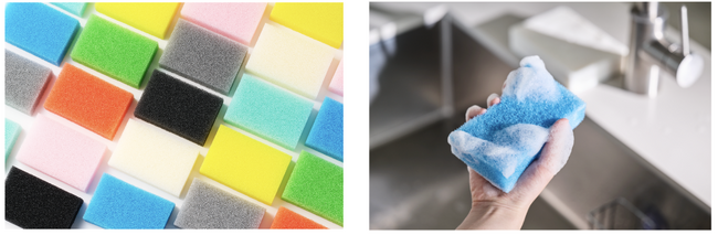 ダイニチ・コーポレーションは創業から、食器洗い用固形洗剤の製造販売を行っています。製造から販売を行う中で、固形洗剤と相性の良いスポンジを研究し、高品質ポリウレタンを使用した、従来のスポンジの概念を覆す「サンサンスポンジ」が生まれました。半年以上使えるほど丈夫で長持ちなので、ごみの削減に。
