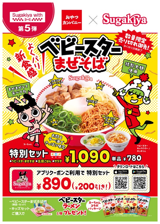 コラボメニュー『ベビースターまぜそば』の発売を記念して、コラボメニューまたはキッズセットをご購入いただいた方に、スガキヤキャラクター「スーちゃん」とベビースターキャラクター「ホシオくん」が描かれたオリジナルパッケージのベビースターラーメンをプレゼント。