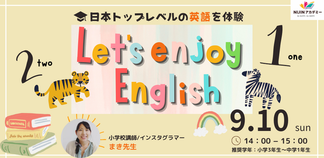 日本中の学校をハッピーにする株式会社NIJIN(本社:東京都江東区、代表取締役:星野達郎)は、小中学生向けオンラインスクール「NIJINアカデミー」を9月1日に開校いたします。日本トップレベルの現役教師による授業を自宅から受けられる環境をつくることで、学校が合わず、学びたくても学ぶ機会を失っている子どもに「学ぶ楽しさ」を提供します。開校に併せ、体験授業を開催いたします。第6弾は、小学校講師で、InstagramやYouTubeで実践を精力的に発信するまき先生が英語の授業を行います。