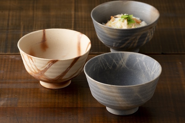 釉薬を使わずに焼き締めた、凹凸があり米がくっつきにくい焼き肌で、炊き込みごはんがよく映える飯碗です。