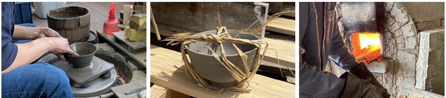 水田を3mほど掘った層にある「田土」を陶土に使用。不老窯の大饗さん作の手挽き飯碗を原型に、型を起こしています。釉薬を使わずに焼き締めた、凹凸があり米がくっつきにくい焼き肌と、稲藁で加飾した「緋襷(ひだすき)」の模様が特長です。