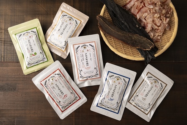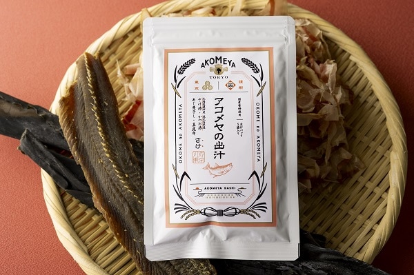 北海道羅臼町産の鮭節、鹿児島県産のかつお節、あじ煮干し、真昆布を使用。鮭節にはアミノ酸が豊富に含まれ、しっかりとした旨みの中にまろやかな甘みが感じられる繊細な味わい。炊き込みごはん、茶碗蒸し、汁物など様々な料理に。