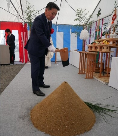 【安全祈願祭の様子】 【鍬入れする下村社長】
