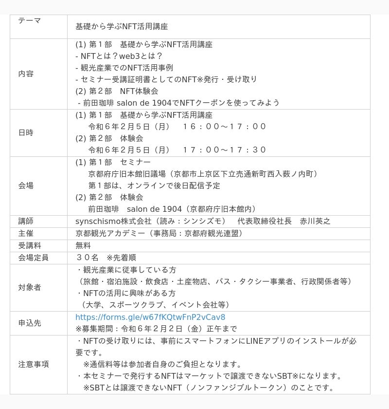 シンシズモ株式会社は、2024年2月5日に開催される京都府観光連盟が運営する京都観光アカデミーにて、京都府内の観光産業従事者を対象にしたNFT活用講座にて講演を行います。