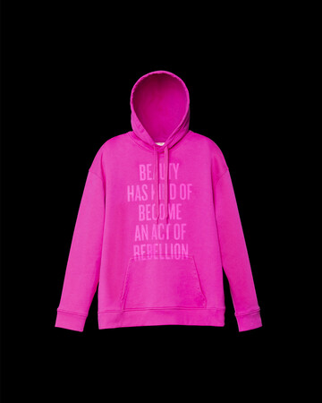 最新のクープランドとのコラボレーションによるカプセルコレクションでは、トーンオントーンのプリントが施されたコットンスウェットフーディーとTシャツが、ピンクPPカラーとブラックの2色で登場します。それぞれのウェアには、4つの異なるメッセージがあしらわれています。