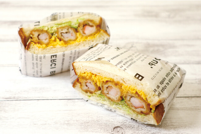 ボリューム満点!プリプリッな海老のフライにとんかつソースをかけ、手作りマヨネーズで味付けたキャベツと、やわらかな口どけのスクランブルエッグを、ペンギン特製バターマヨネーズを塗った食パンでサンドしました。
