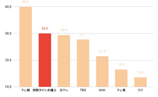 岡野タケシ弁護士、主要テレビ局のYouTubeチャンネルの総再生回数(単位:億回)(※)