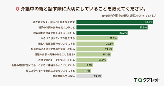 親と話す際に気にしていることを尋ねたところ、「声だけでなく、なるべく顔を見て話す」が40.8%、「体調や気分を気づかう」が37.9%、「最後まで話を聞く」が27.2%といった、相手への思いやりに関する回答が多く見られました(n=169/介護中の親と連絡をとっている方)。