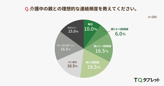 介護中の親との理想的な連絡頻度について尋ねたところ、「毎日」が10.0%、「週に4~6回程度」が6.0%、「週に2~3回程度」が16.5%、「週に1回程度」が19.5%となり、合わせて52.0%が「週に1回以上」を希望していることがわかりました。(n=200)。