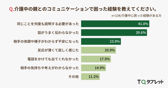 親とのコミュニケーションで困った経験を尋ねたところ、「同じことを何度も説明する必要があった」が41.0%で最も多く、「話がうまく伝わらなかった」が39.6%、「相手の体調や様子がわからず不安になった」が23.9%と続きました(n=134/介護中に困った経験がある方)。