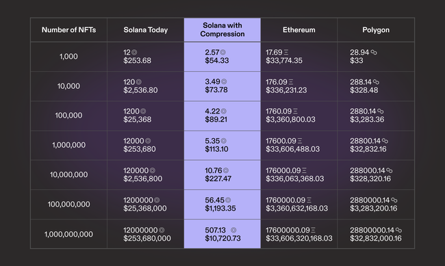 (参考記事)State compression brings down cost of minting 1 million NFTs on Solana to ~$110: https://solana.com/news/state-compression-compressed-nfts-solana