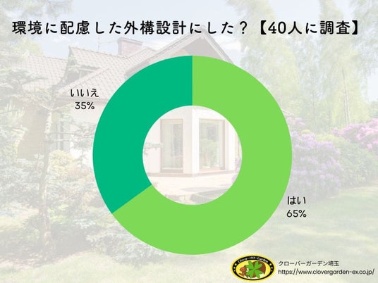 最近の調査によると、環境やエコに配慮した外構設計を採用している人々の割合は、全体の65%に上ることが明らかになりました。このデータは、40人のサンプルに基づいており、26人がエコな外構設計を実践していると回答しました。一方で、35%にあたる14人はそのような措置を取っていないと答えています。