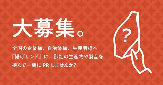 日本にはその土地々々の食材や食文化があります。全国的に有名な名物から、地元の方に愛され続ける密かな名産品まで多種多様。そんな食を作り出す企業様、生産者様と一緒に『揚げサンド』を作りたい。一緒に広めていきたいと考えております。「もしかしたら揚げたパンに挟んだら美味しいかも」「合わないかもしれないけどPRしたい」そんな企業様、生産者様は、是非、広報担当 中嶋までご一報ください。