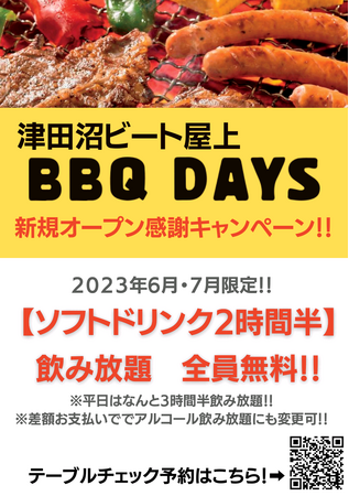 バーベキュー予約ならBBQDAYS!JR津田沼駅すぐ!の津田沼ビート屋上にてバーベキュー場「BBQDAYS津田沼ビート店(TEL 080-3440-9739)」がオープン。期間は7月1日-10月22日。