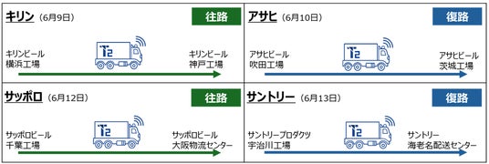 株式会社T2(代表取締役CEO:森本 成城、以下「T2」)は、酒類・飲料の物流子会社であるアサヒロジ株式会社(代表取締役社長:児玉 徹夫)、キリングループロジスティクス株式会社(代表取締役社長:小林 信弥)、サッポログループ物流株式会社(代表取締役社長:服部 祐樹)、サントリーロジスティクス株式会社(代表取締役社長:高橋 範州)の4社(以下、「4社」)とともに、2025年6月9日より、T2が開発した自動運転トラックを用いて、関東から関西までの高速道路の往復路で4社の製品をそれぞれ幹線輸送*¹する実証を開始し、輸送の有効性と具体的なオペレーションを検証します。