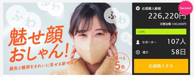 「ふわふわうさちゃん3Dマスク」はプロジェクト開始から4日間で目標金額の226%を達成しており、注目商品となっています。本製品は2021年1月8日に発売を開始し、累計販売枚数1,000万枚を突破した「ふわふわうさちゃんマスク」の新シリーズです。