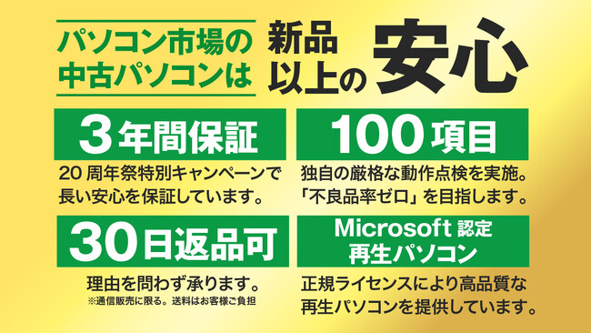 中古パソコン全商品(訳あり商品を除く)が3年保証付きで、パソコン全品を送料無料でお届けしています。お買い得商品も数多く取り揃えておりますので、ぜひこの機会にパソコン市場へお越しください。