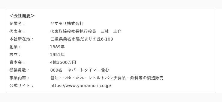 1889年三重県で創業し、今年で135年目の老舗の総合食品メーカーです。醤油醸造業としての祖業以来「変革への挑戦」を続け、様々な業界初の技術及びマーケティングの革新を通じて、変化する市場のニーズを常に汲んだ取り組みを行ってきました。膨大なレシピベースと経験が支える「おいしさ」を礎にした”エンターテインメント&健康”をコンセプトにした商品の開発でお客様のスマイルを創造する企業として活動しています。