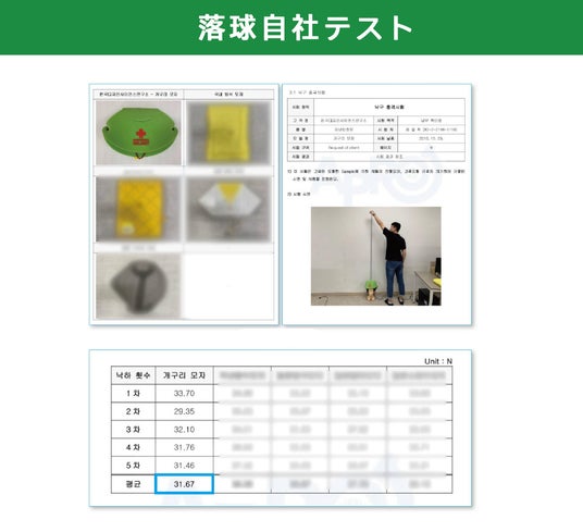 150cmの位置から95gの鉄球自由落下にて上頭部の衝撃力を測定。