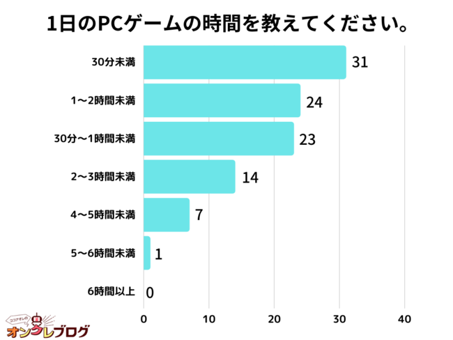 「1日のPCゲーム時間の時間を教えてください。」アンケート調査した結果、1位は『30分未満』でした。