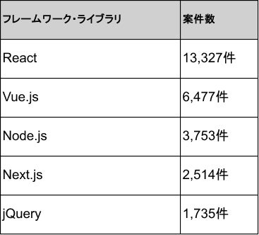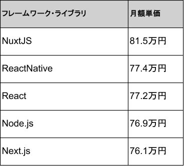 技術面ではNuxt.jsが81.5万円、React Nativeが77.4万円、Reactが77.2万円、Node.jsが76.9万円、Next.jsが76.1万円と月額単価が高く、SSRやクロスプラットフォーム開発、Edge Renderingを組み合わせれば単価をさらに高めやすい構造です。