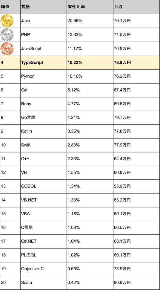 TypeScriptの案件は市場全体の10.22%を占めており、案件数ランキングでは4位に位置しています。JavaやPHP、JavaScriptに次ぐシェアを確保しつつ、平均月額単価は76.9万円と高水準を維持しているため、案件ボリュームと報酬バランスの両面で魅力があります。