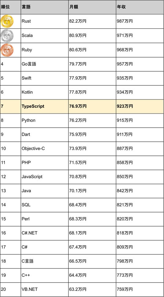 TypeScript案件の平均月額単価は76.9万円、平均年収は923万円で、年収ランキングでは7位に位置しています。TypeScriptはJavaScriptに型システムを追加した言語であり、フロントエンドではReactやAngular、バックエンドではNode.jsなどのランタイムで広く採用されています。