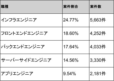 職種別の案件割合はインフラエンジニアが24.77%、フロントエンドエンジニアが18.60%、バックエンドエンジニアが17.64%を占めており、IaC(Infrastructure as Code)とCI/CDを扱いながらフロントエンドからAPIまで一貫してTypeScriptで開発できる人材が重宝されています。