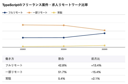 2025年5月時点でのTypeScriptフリーランス案件・求人のリモートワーク比率は、フルリモートが42.8%、一部リモートが51.7%、常駐が5.4%です。TypeScript案件のフルリモート割合(42.8%)は前月比+13.4%と大幅に増加した一方、一部リモートが過半数を維持しています。