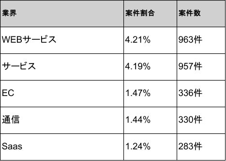 TypeScript案件はWebサービスが4.21%(963件)で最多、サービスが4.19%(957件)と僅差で続き、ECが1.47%(336件)、通信が1.44%(330件)、SaaSが1.24%(283件)となり、上位5業界で約12%を占めます。