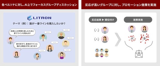 3.複数のペルソナ同士がLITRON MAS上で設定したテーマ(注3)に関して、会話またはグループディスカッションを行い、テーマに対する示唆(注4)を生成。