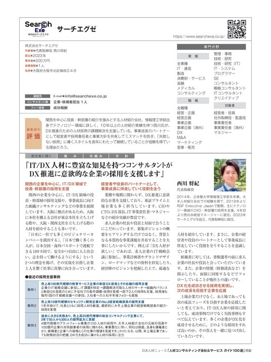 サーチエグゼは、関西を中心に役員・幹部層の紹介を強みとする人材紹介会社。情報理工学部出身でテクノロジー領域に詳しく、10年以上の人材紹介実績を持つ西川氏が、DX推進のための人材採用の課題解決を支援している。事業成長のパートナーとして経営者や採用責任者と事業方針を共有してミスマッチを防ぎ、「失敗しない採用」に導くスタイルを長年にわたって継続していることが信頼を得ている理由だろう。