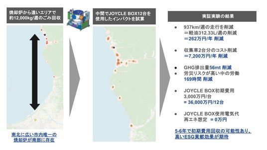 その結果、石狩市内について「JOYCLE BOX」12台が、収集車2台を代替した場合、年間CO2排出量を約56トン、燃料消費量を16,280リットル、運搬コストを7,200万円削減できる可能性が試算され、労働環境の改善についても、労働時間を169時間削減できることが確認されました。