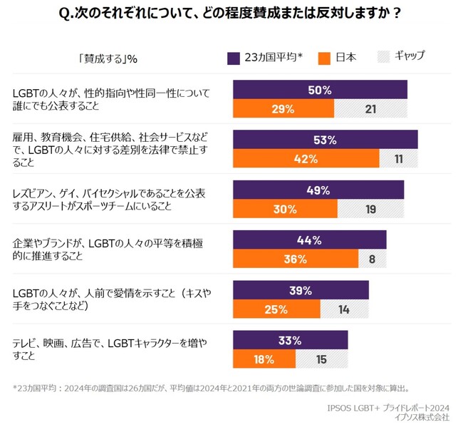 一方で、LGBT+の人々が自身について公表すること、LGBT+の人々への差別に関する法整備、企業やブランドによる平等の積極推進、テレビ・映画・広告でのLGBTキャラクターの起用など、LGBT+の人々の活動を支援するような動きに賛同する日本人の割合は、いずれの項目においてもグローバル平均を下回る結果となりました。