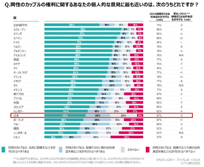 「同性カップルは結婚することも他の法的承認を得ることも許可されるべきではない」と強い反対を示した日本人は6%でした。これは、スペインと並び、調査対象26カ国の中で最も少ない割合です。