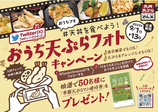 サトフードサービス株式会社(本社・大阪府大阪市、代表取締役社長・杉本 貴之)が運営する「天丼・天ぷら本舗 さん天 」では、2023年9月1日(金)~9月13日(水)まで、「季節天ぷらマシ優待券」が50名様に当たる、お得なX(旧Twitter)キャンペーンを開催します。天丼・天ぷら本舗さん天の公式アカウントをフォローし、キャンペーン応募ツイートをやコメントをすることで応募いただけます。