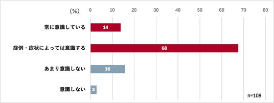 「常に意識している」(14%)と「症例・症状によっては意識する」(68%)を合わせて、総合診療医の82%が「希少疾患を意識して診療している」と回答しました。