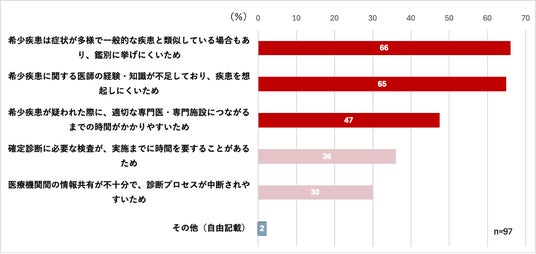 希少疾患の確定診断までに時間がかかる理由として、「希少疾患は症状が多様で一般的な疾患と類似している場合もあり、鑑別に挙げにくいため」(66%)、「希少疾患に関する医師の経験・知識が不足しており、疾患を想起しにくいため」(65%)、「希少疾患が疑われた際に、適切な専門医・専門施設につながるまでの時間がかかりやすいため」(47%)が主に選択されました。