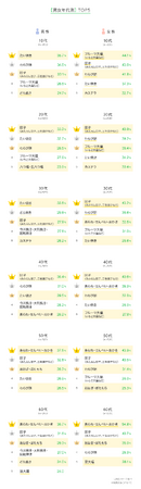 男女年代別にみると、全体1位の「団子」はすべての年代でも3位以内にランクインしました。男性よりも女性のほうが高い割合で、女性のすべての年代で4割を超え高くなっていました。