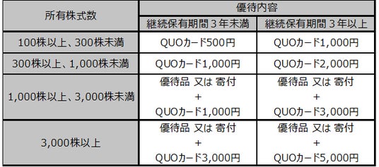 - 対象範囲の拡大(最低100株以上保有でQUOカードを贈呈)