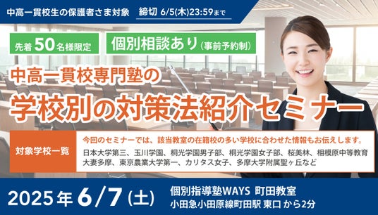 株式会社メイツ(本社:東京都新宿区 代表取締役:遠藤尚範)が運営する『中高一貫校専門 個別指導塾WAYS(以下、WAYS)』では2025年6月7日(土)に町田にて、中高一貫校に通う生徒・保護者さまを対象とした、学校別の対策法紹介セミナーを開催いたします。