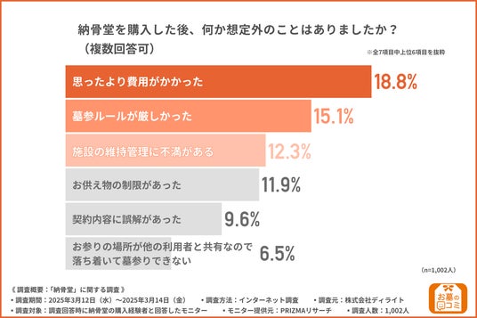 続いて、「納骨堂を購入した後、何か想定外のことはありましたか?(複数回答可)」と質問したところ、『思ったより費用がかかった(18.8%)』と回答した方が最も多く、『墓参ルールが厳しかった(15.1%)』『施設の維持管理に不満がある(12.3%)』と続きました。