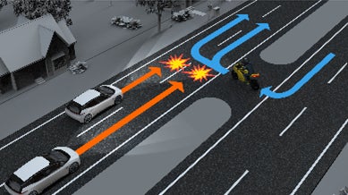 夜間の安全運転には周囲の走行車両の挙動をドライバーがいち早く視認することが重要で、視認の遅れは交通事故につながる恐れがあります。特に車体の小さい二輪車は周囲から動きを視認されにくく、右折や合流・Uターン時などに他の車両から衝突される危険性が高まります。周囲の走行車両は、二輪車のヘッドランプ・リアランプにより車体の動きを判断する必要があります。