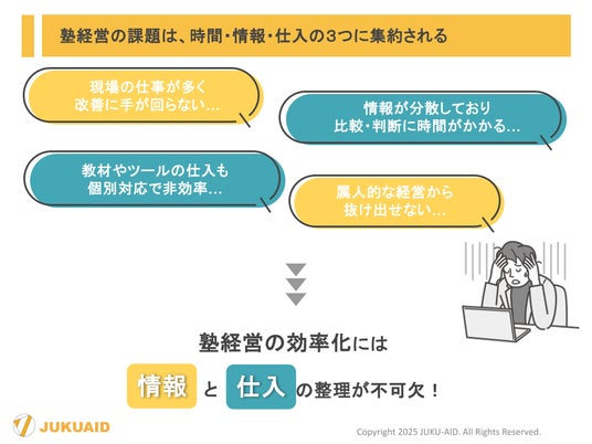 JUKU Plus!は、「時間がない」「情報がない」「人がいない」といった塾オーナー・教室長の課題を、塾エイドがボランタリーチェーンとして実現している“情報の集約 × 仕入の集約” によって解決するためのプラットフォームです。
