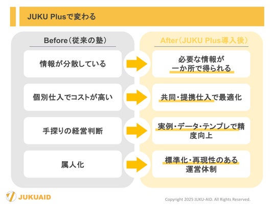 「塾の成功と学生の成長を両立させ、より広く価値を提供したい」という目的・志のもとに主体的に集まり、相互に協力して地域教育に貢献するための塾・スクール経営の組織である塾エイド(運営法人:株式会社インサイト・ジャパン、代表取締役社長: 鴨志田順)は、塾エイドの有料会員サービス『JUKU Plus!』を正式にリリースいたしましたのでお知らせいたします。